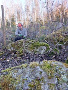 Kyseinen aitauskohde sattui olemaan isäni lapsuuden maisemissa ja seutu oli minullekin osittain tuttua. Isä varoittelikin kivisestä maastosta, mutta silti se pääsi yllättämään. Majapaikka löytyi sukulaisten kautta vanhasta maatalosta, jossa minäkin olen lapsena viettänyt kesäisin aikaa. Oli huimaa palata takaisin ja löysinkin vanhan talon kuistilta tekemäni piirustuksen vuodelta 1989.