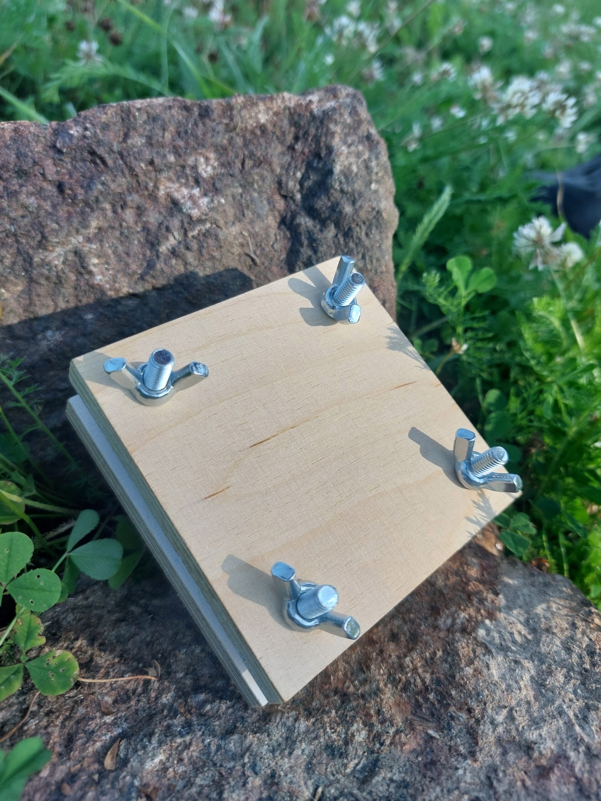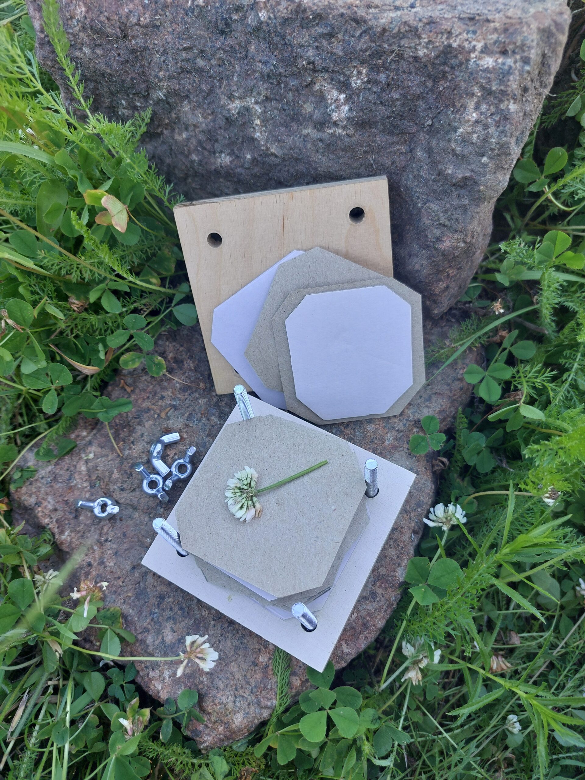 Miniprässi on valmistettu vanerin jämäpaloista – jokainen kappale on siis ainutlaatuinen ja vastuullisesti tehty. Se sopii erinomaisesti apiloiden, lemmikkien ja muiden niittykukkien prässäämiseen kenttäkäytössä tai kotona.